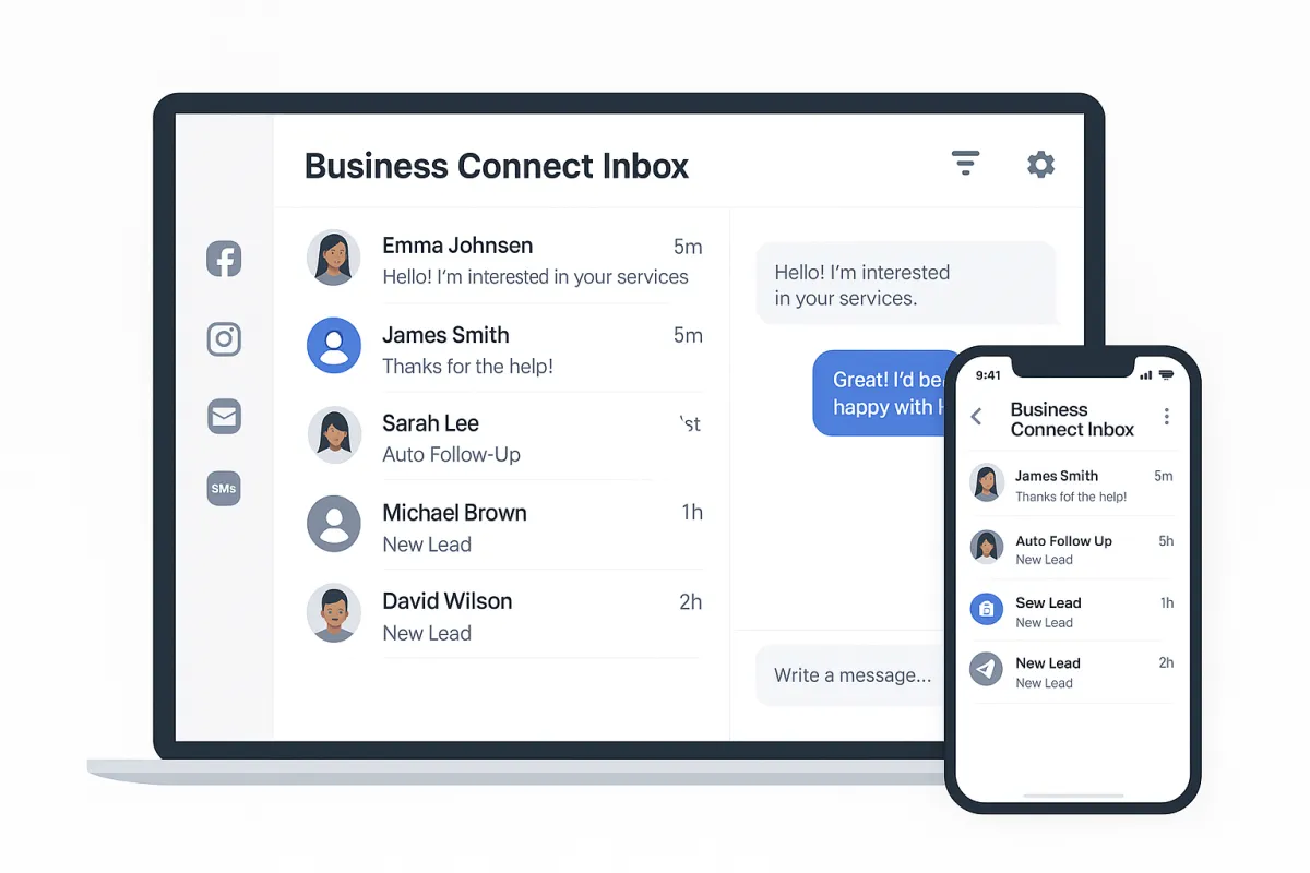 Stop switching apps. Business Connect pulls all your social media messages, DMs, comments, emails and texts into one smart inbox. It replies instantly, follows up automatically and keeps every conversation moving forward, even when you’re busy or offlin, helping you close more business.